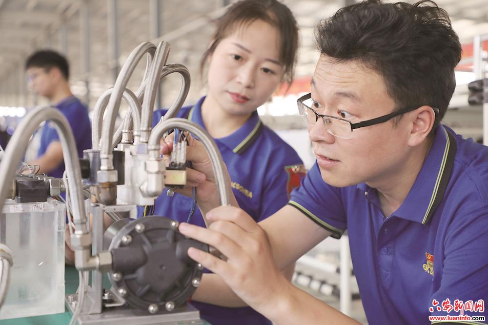 图为9月6日,六安索伊电器制造有限公司智能炒菜机预装装配线上,市总工会网络工作部工作人员张东(右一)在师傅的带领下,学习电磁阀组件测试。