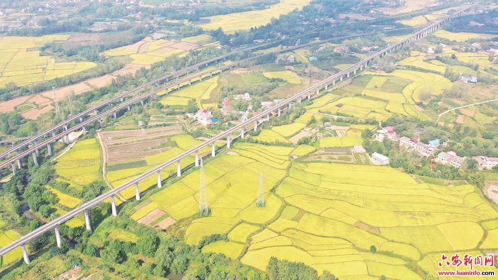 9月13日,裕安区城南镇境内,纵横交错的交通路网与满目金黄的乡村、农田相映成景。金秋时节,我市各地秋色显现,大地色彩斑斓,呈现出一派“环境美、乡风美、生活美”的美丽“丰”景。(皖西日报融媒体记者 田凯平 摄)