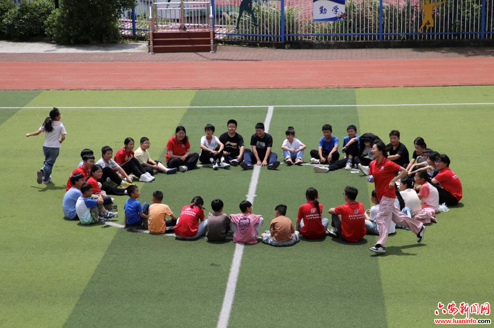 7月9日,金寨县花石实验学校,滁州学院支教队员带领孩子做游戏。 曹纯摄