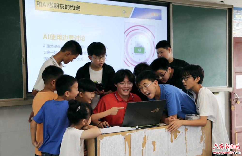 7月9日,金寨县花石实验学校,滁州学院支教队员教孩子们使用AI工具。 曹纯摄