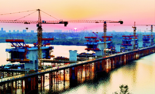 11月11日傍晚,金安区城北镇境内,合武高铁六安淠河特大桥(金裕淠河特大桥)紧张的施工现场与天边绚丽的晚霞交相辉映,构成一幅壮美的初冬施工画卷。
