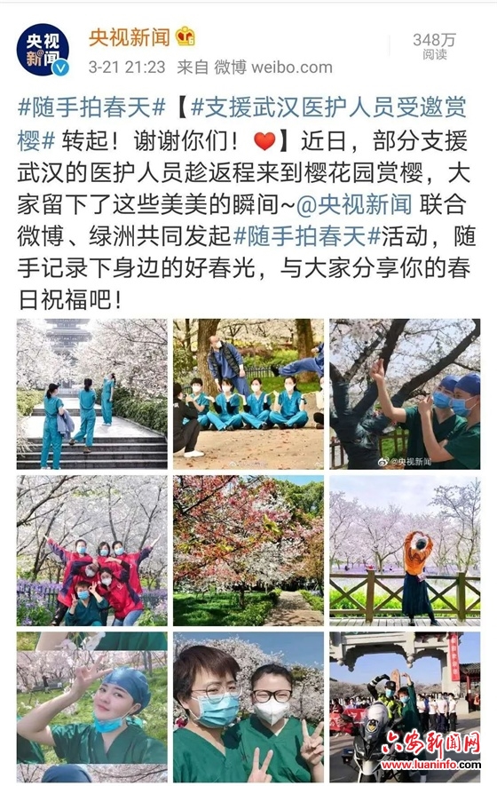我们一群人纷纷在樱花树下合影留恋,很久没有的放松。值得一提的是,我把照片发到微博上,竟然被央视官方微博采用了,在央视微博上看到了自己的照片,真的特别开心,还有点受宠若惊。
