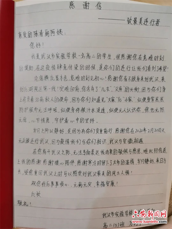 尊敬的武汉市江岸区教育局老师们、酒店工作人员、志愿者、片区民警、车队师傅、厨师及送餐团队、理发师团队以及顺丰、京东快递团队:你们辛苦了!我们是安徽省支援湖北医疗队第七批队员,自2020年2月20日援助武汉抗疫工作至今整整一个月的时间,我们不负使命,你们完成任务……在这一个月的相处中,你们事无巨细、亲力亲为、甚至也需披星戴月、深夜作战,24小时不间断值守,为我们辛苦付出、默默奉献。我们都看在眼里,记在心里!在这里道一声感谢,再感谢! 胡经理、花花经理、小橙子、小童等工作人员你们辛苦了!印象最深刻的是,2月20日晚九点我们带着内心的紧张与不安抵达酒店时,你们的微笑给我们吃了定心丸。在入住、对接各种事宜时,酒店工作人员交流群像沸腾的小泡泡,冒出多不胜数需要解决的小问题。你们逐一解答,从文字中能感受到你们的礼貌及耐心。第二天一早无意中听到一个小哥哥说,他们三四个人整夜未眠,一直在为我们这支170名的队伍解答各种小问题,我们知道你们的辛苦不比我们少。有些时候我们队员会稀里糊涂把自己锁在门外,无论什么时候只要一个电话,你们就会第一时间冲出来刷房卡,毫无怨言。为了让我们吃上热乎乎的饭菜,你们一天三次雷打不动的在群里提醒我们拿餐饮,为我们解决各种各样的生活问题! 江岸区教育局的朱老师、张老师、高老师、顾老师,还有我们认识又叫不出名字的老师们,你们辛苦了!无数次的日晚间消毒喷洒,爱心小超市里的吃的喝的用的、小书吧里的各类书籍,爱心小黑板上变换的美丽的板报,体育用品如羽毛球拍、跳绳等,只有我们想不到的,没有你们办不到的,你们全方位为我们考虑,只为放松我们的身心。酒店有房间,可是老师们晚上却坚持在大厅休息,只为更好的服务我们。凌晨三四点的大厅每天都留有一盏灯和一名老师,你们说:“我们为夜班回来的你们留一个门,像一个家。”记得有一次下夜班,我们一群人叽叽喳喳说还有什么吃的,老师喷洒完立即跑过来告诉我们晚餐有哪些菜品,今天爱心超市里有什么新鲜的好吃的,想吃橘子的话可能没有了……凌晨的武汉,听着您的絮絮叨叨,那一刻,我们觉得听到了最动听、最温暖的声音。一个小伙伴特意提到要感谢,因为她的手机坏了,专班老师不怕麻烦,借手机、修手机,又在不上班的情况下特意送过来,满满都是对我们的爱与关怀! 负责接送我们的车队师傅们,你们辛苦了!数不过来每班车接与送的次数,尤其凌晨下班、视野受限,队员们经常下班时找不到车,师傅们就立马跑过来招呼我们过去坐上车,“安徽队的!”,刺骨的寒风阻挡不住你们前行的脚步。为了不落下一个队员,让大家平平安安上班,安安全全下班,你们一遍遍不厌其烦的确认人数,时常看到师傅们布满血丝的眼睛,心疼,也让我们觉得你们的眼睛如此美丽! 为我们提供用餐服务的三家厨师及送餐团队,你们辛苦了!请原谅我们的众口难调,但是我们知道你们做的每一餐都在花费心思。每次去取餐的时候,总是先看见你们的餐车一个漂亮的摆尾,迅速停好,再看到你们百米冲刺的样子,近乎于飞跑把一箱箱飘香四溢的可口饭菜分发给我们,只因怕耽误我们的上班时间。寒冷的天气还能看到你们脸上挂着的汗水。餐点花样繁多、荤素搭配,小龙虾、口水鸡、排骨汤、热干面,轮番上阵,甚至还有周黑鸭等等,统统进了我们的肚子,有你们,我们的胃真的很幸福!三八女神节那天,江岸区和酒店的老师为我们准备的礼物,不仅仅温暖了我们女同胞还有男同胞的心。尤其是长春街小学老师们的那一封慰问信以及里面的两首诗,纸短情长。湖北省人民政府以及指挥部转交的感谢信,也让我们深深感动。江岸区教育局的老师们知道我们休整的消息后紧锣密鼓地安排组织我们畅游东湖樱花园,这期间专班人员、酒店工作人员、车队师傅、樱花园园区志愿者还有配合我们合影的铁骑小哥哥你们都辛苦了,来来回回为我们服务,还为我们拍上最美的照片,让我们看到了武汉最美的樱花,也看到了你们最美的心灵! 还要特别感谢为我们数次修剪头发的理发师团队,为我们数次搬运行囊的顺丰、京东快递小哥们。要感谢的人还有很多、很多,要说的话也远远不止,正是因为你们像家人般无微不至的照顾与关心,温暖着我们,使我们队员备受鼓舞,减少了思乡情绪,坚定了工作信心。你们、我们众志成城、团结一心,才能共克时艰、迎来曙光。英雄的武汉,英雄的武汉人民,你们坚强、你们感恩、你们热情!我们安徽支援湖北第七批医疗队队员永远牢记在心! 这抗疫的一个月时间,我们已经对武汉这座城市有了特殊的感情。有太多的不舍和感恩,言语不足以表达我们对这个城市的喜爱,对武汉人民的感谢!春已到,花已开,期待疫情过后武汉更加美好的明天!期待各位老师都能够遇到最好的未来!最后童佳兵领队携全体队员再次对你们默默的付出表示感谢!真诚欢迎大家一起到我们安徽去做客!