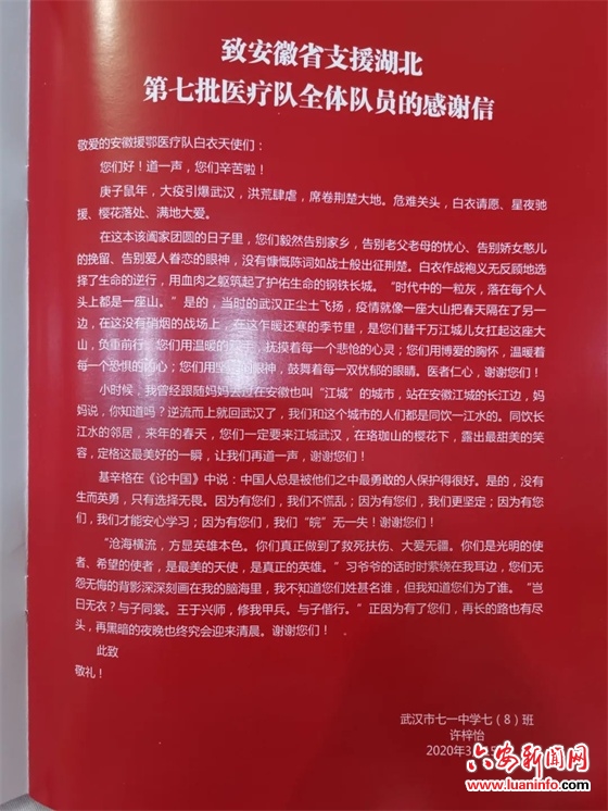 最后,附上由我执笔代表我们安徽省第七批医疗队向武汉当地人民写的一封感谢信。