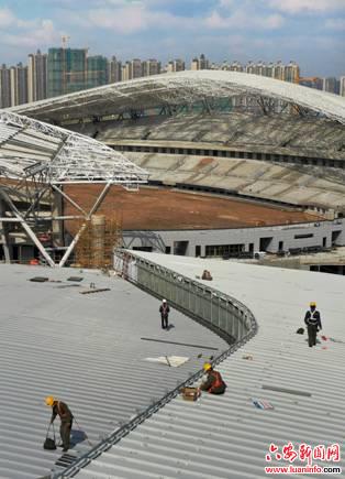 3月28日,市重点工程河西体育中心建设项目现场,正有条不紊的进行场馆顶部装饰施工。连日来,随着复工复产“重启键”按下,我市多措并举有力有序推进各项重点工程建设进程。据了解,在严格做好防疫工作的前提下,市体育中心于2月26日实现复工以来,抢工期保质量抓进度,目前体育场和体育馆全面进入装修、剩余机电桩的末端及主要设备的安装阶段,受疫情影响,体育场和体育馆工期力争在8月底完工。(皖西日报融媒体记者田凯平摄)