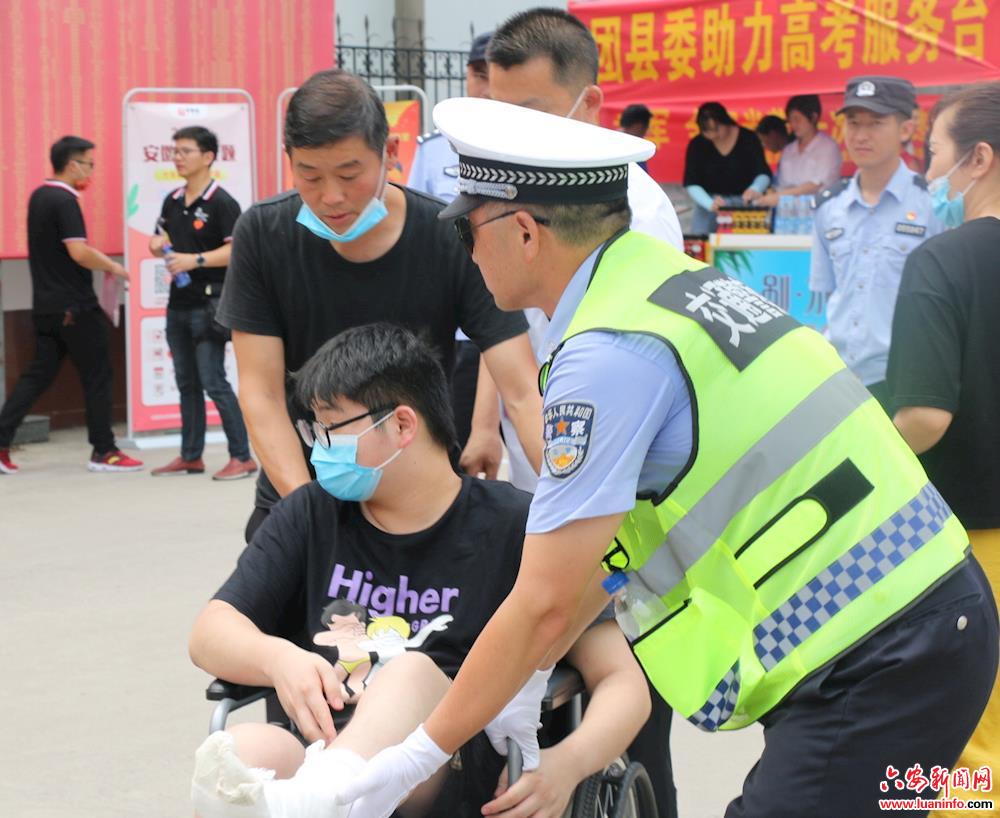 7月7日高考首日下午,霍山县公安局交管大队民警正在霍山中学考点周边维护交通秩序,突然,一名坐着轮椅的“特殊考生”吸引了民警的注意。只见这位考生在父母的帮助下艰难的推着轮椅。发现这个情况后,民警二话不说,一路小跑到考生旁边,推着轮椅,帮助考生参加体温检测,将考生一路护送至考场才放心离开。( 杨锟)