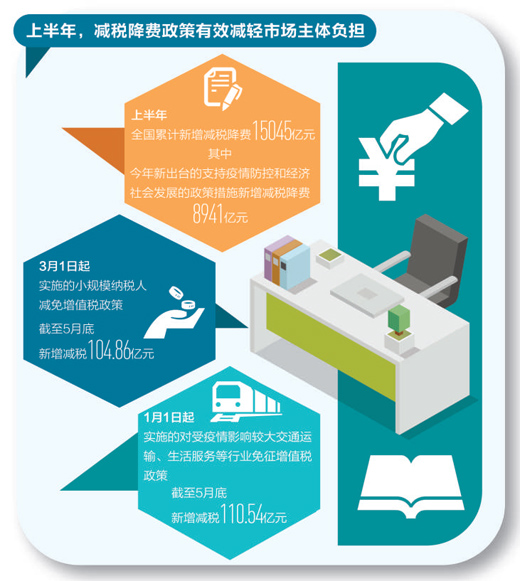 今年以来,面对复杂严峻的经济形势,党中央、国务院及时部署出台了一系列减税降费政策,助力市场主体纾困发展。上半年全国新增减税降费15045亿元,有效减轻了市场主体负担。
