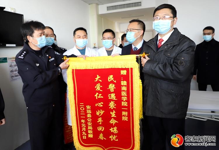 为表达对该院医护人员的感谢和敬意,安远县公安局将绣着“民警遇袭生命堪忧 大爱仁心妙手回春”字样锦旗和一封感谢信送至赣医一附院医护人员,并连声称赞赣医一附院医护人员医术精湛、医德高尚、作风优良、敢于担当。