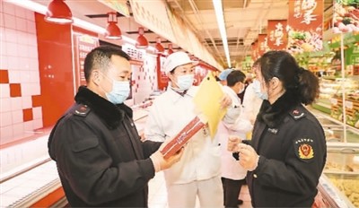 近期,河北省邯郸市广平县市场监管部门加强监督抽查和执法检查,净化节日市场消费环境。图为日前,广平县市场监管局广源分局执法人员在超市对肉类食品专柜进行执法检查。