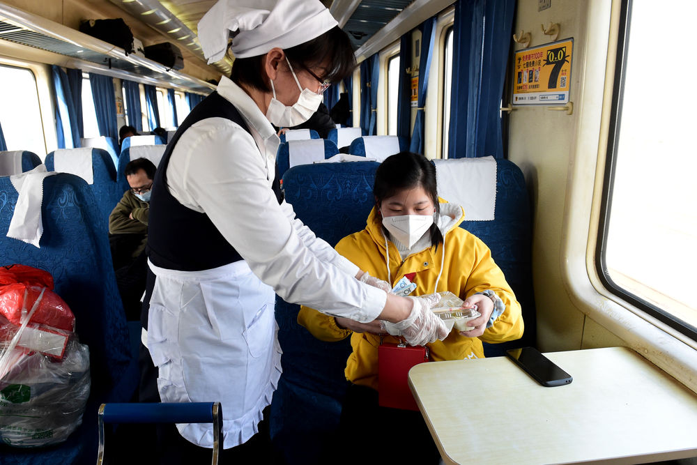 ↑2月3日,施凤荣在K94次列车上将盒饭递到旅客手中。