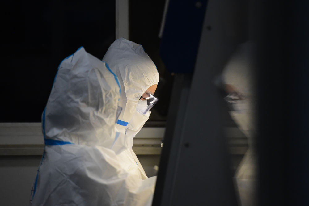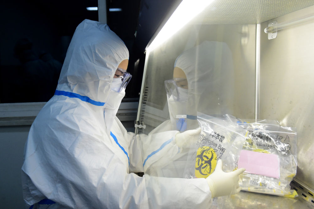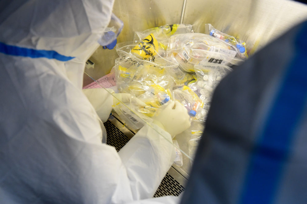 ↑2月2日,柏玉婷在合肥迪安医学检验实验室有限公司内的生物安全柜前处理核酸样本。