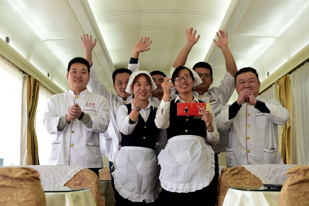 ↑2月3日,施凤荣(右三)和餐车工作人员在K94次列车上合影。