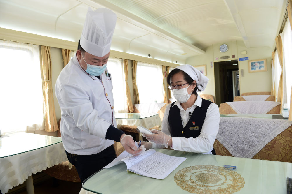 ↑2月3日,施凤荣在K94次列车上为餐车工作人员测量体温。