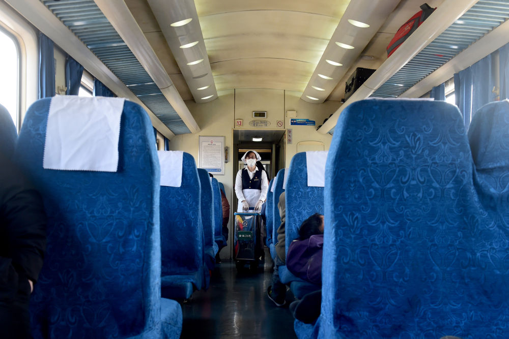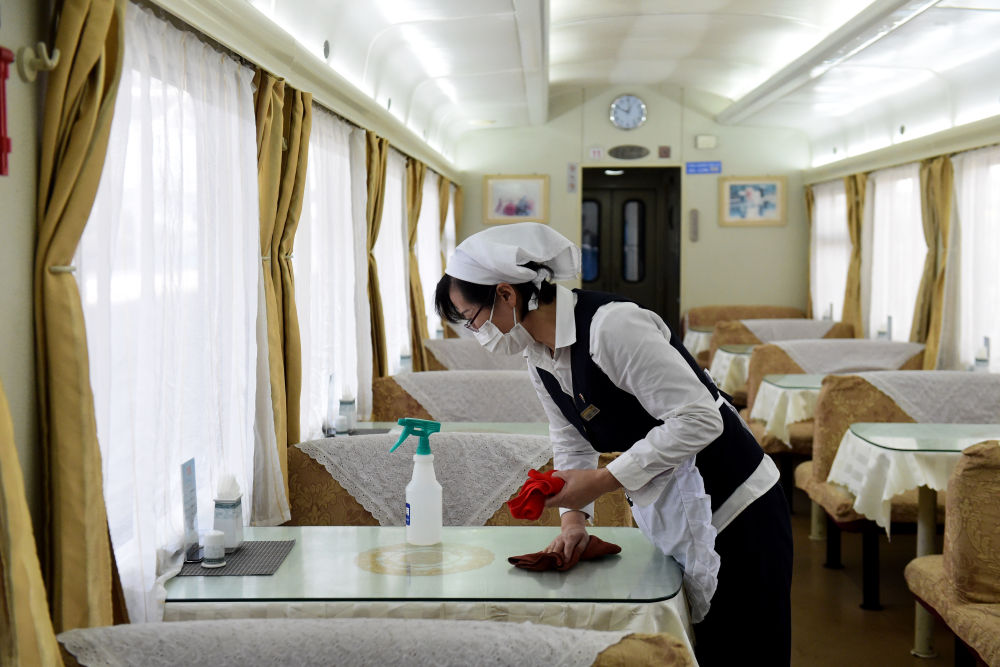 ↑2月3日,施凤荣给K94次列车的餐车桌椅消毒。