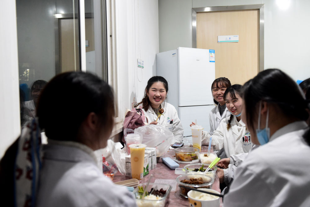 ↑2月2日,柏玉婷(左二)和同事们一起在合肥迪安医学检验实验室有限公司的休息室吃晚饭。
