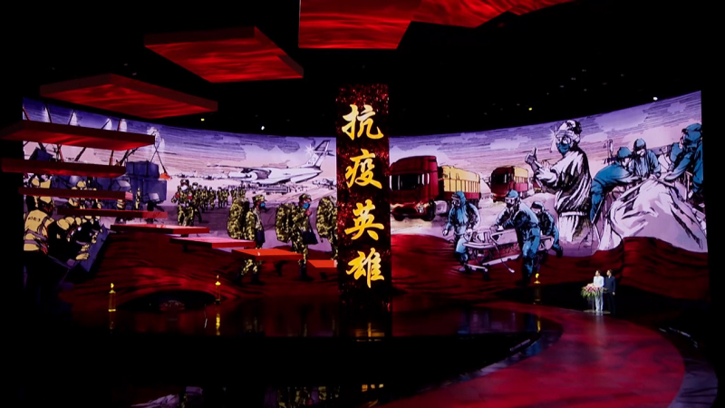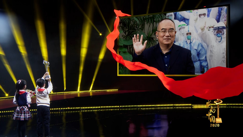 在舞台中央高大竖碑上的奖杯,一直是感动中国的传统标志。2020年感动中国开场时,巨大红绸从天而降的过程是凭借虚拟技术的“助攻”完成的,使奖杯揭幕的过程更加逼真。