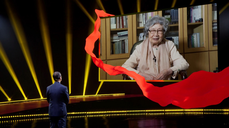 四海弘文,一灯传道,叶嘉莹是“诗词的女儿”、“风雅的先生”。在为叶先生颁奖时,以虚拟技术呈现的诗词研究手稿飘满舞台、汇成长河,凸显了叶先生作为中国传统文化摆渡人的概念。