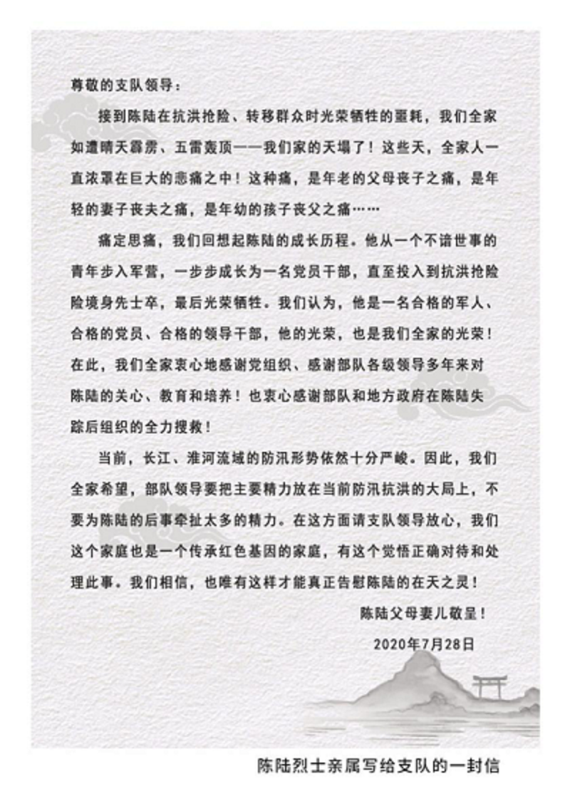 在抗洪时为营救群众而牺牲的陈陆年仅36岁,在寻访他的家属时,摄制组得知陈陆的父亲是一名退役军人,儿子牺牲后第三天,他就给上级亲笔写信说“抗洪形势依然严峻,希望把主要精力放在防汛抗洪大局上,不要为安排陈陆的后事牵扯太多的精力”。一位老父在面临丧子之痛时依然顾全大局,让人动容。