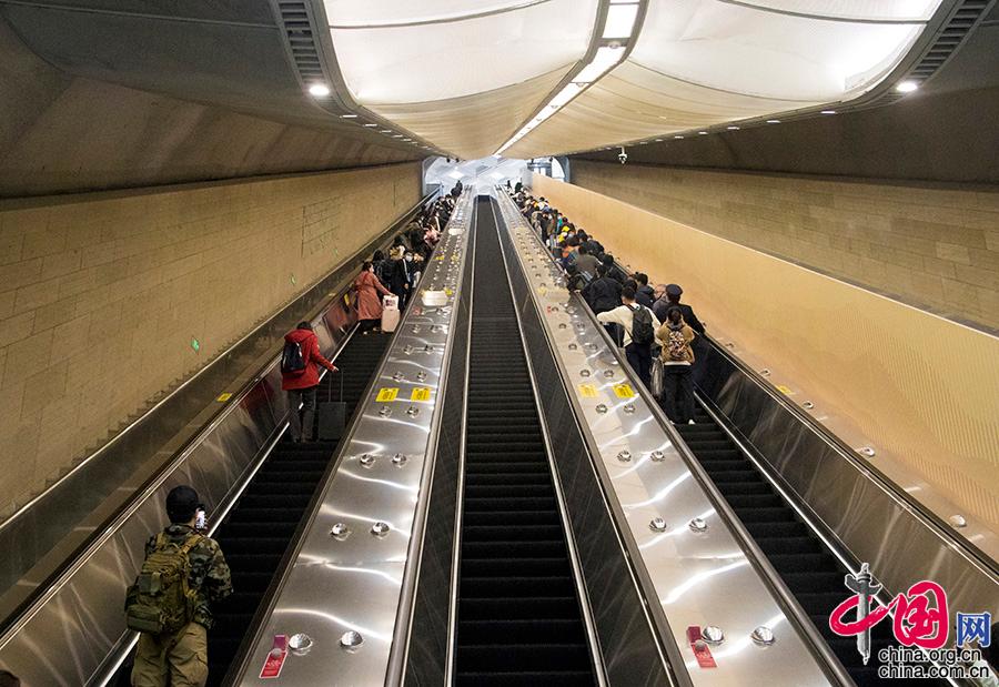 八达岭长城站是国内一次提升高度最大的高铁地下车站。车站首次采用一次提升长大扶梯及斜行电梯,旅客出站电梯提升高度达到42米。中国网记者 马旷/摄