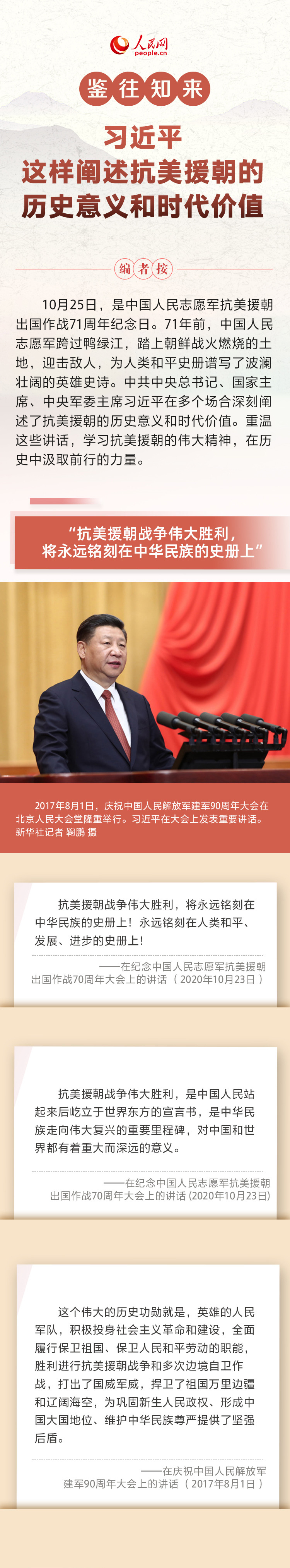鉴往知来 习近平这样阐述抗美援朝的历史意义和时代价值 编辑:高方勇 来源:人民网-中国共产党新闻网 浏览次数: 次 发布时间:2021-10-26 08:46:31 【字体:小 大】 扫一扫在手机打开当前页 【打印正文】 上一篇:全球连线 | 重磅微视频:50年,一支话筒的见证 [ 2021-10-26 ] 下一篇:冰雪之约 中国之邀|跟着总书记“踏冰走雪” [ 2021-10-26 ]