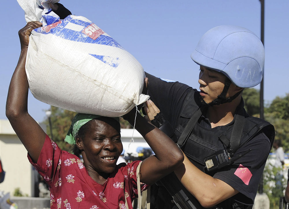 ↑2010年2月2日,在海地首都太子港,中国赴海地维和警察防暴队队员帮助地震受灾居民领取救济粮食。