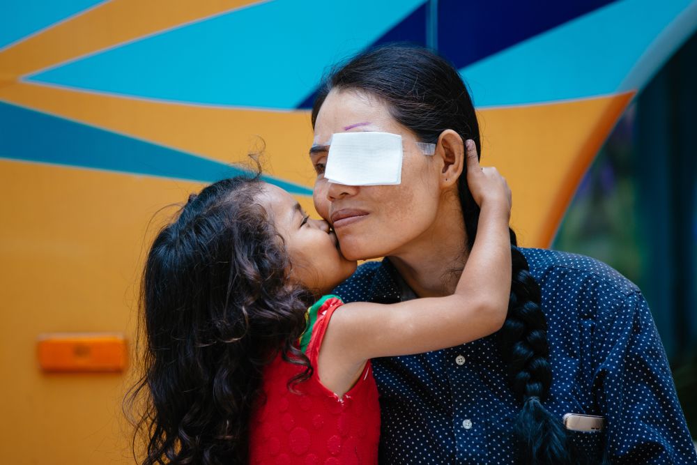 ↑2019年3月15日,在柬埔寨磅湛省医院,接受中国医疗队白内障义诊手术患者孙美乐得到女儿亲吻祝福。