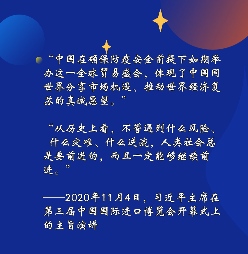 突如其来的新冠肺炎疫情给各国带来严重冲击,也给世界经济带来重创。在2020年举行的第三届进博会上,习近平主席诚挚的话语,为世界注入强大信心——