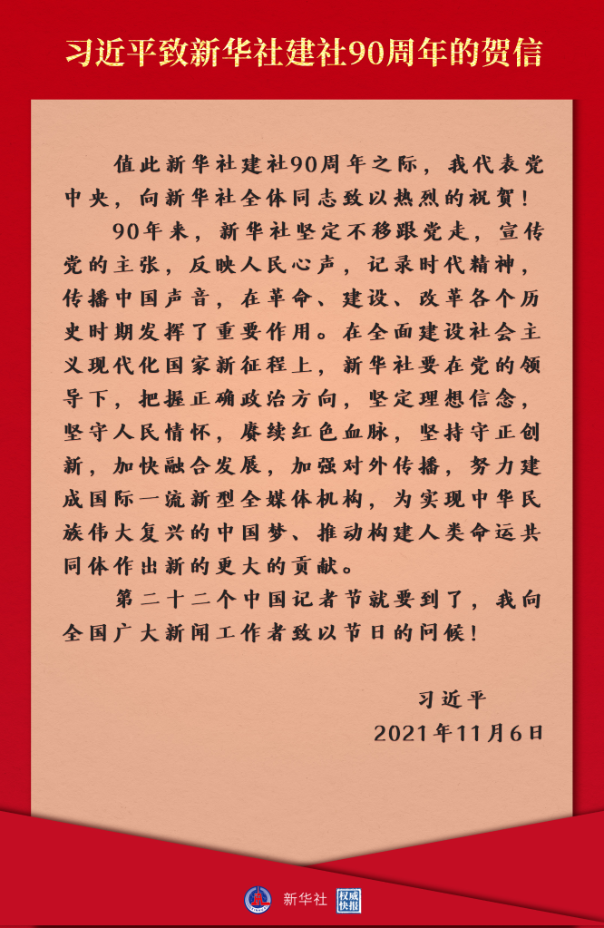今年11月6日,在新华社建社90周年之际,习近平总书记专门致信祝贺,寄语新华社:要在党的领导下,把握正确政治方向,坚定理想信念,坚守人民情怀,赓续红色血脉,坚持守正创新,加快融合发展,加强对外传播,努力建成国际一流新型全媒体机构。