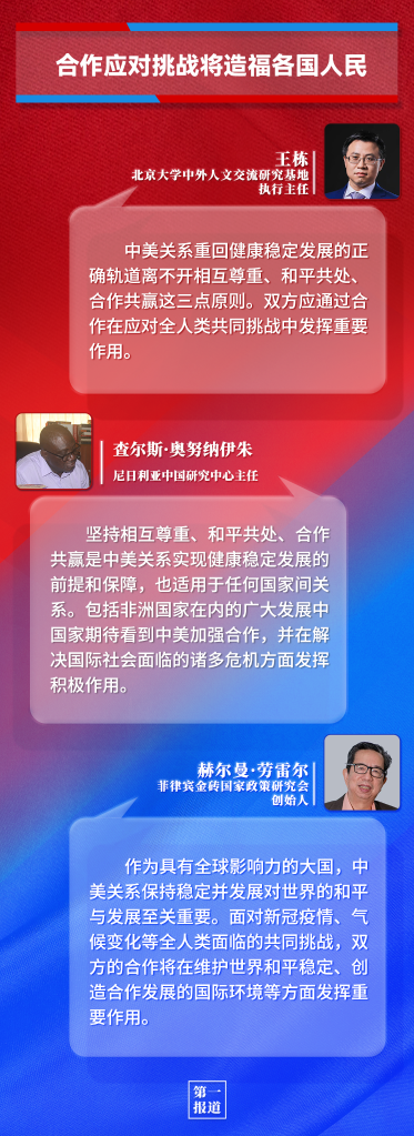 此次会晤世界瞩目,多国人士积极评价。他们认为,中美元首会晤有助于推动中美关系重回健康稳定发展的正确轨道,造福中美两国人民和世界各国人民。