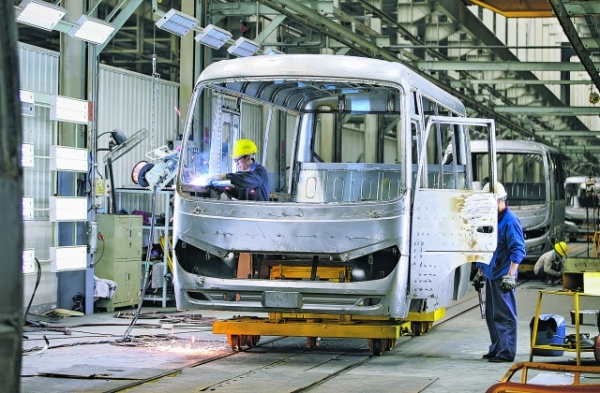 奇瑞万达贵州客车股份有限公司技术人员在焊接客车骨架。