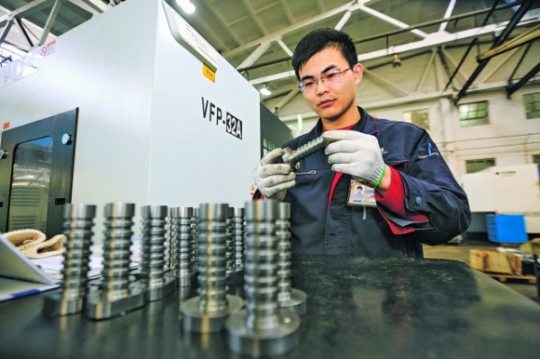 贵州枫阳液压有限责任公司加工车间内,工作人员在检查半成品。