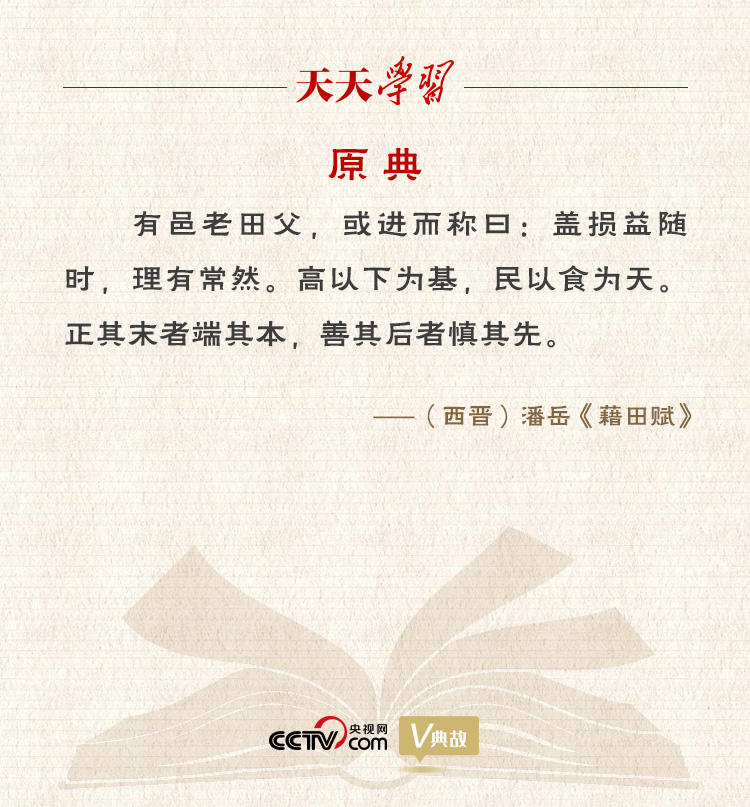 在《藉田赋》中,潘岳不仅歌颂了藉田场面的宏大,还借“田父”之口对藉田礼的意义进行阐释:“高以下为基,民以食为天。正其末者端其本,善其后者慎其先。”末:树梢,古时称工商业为末业;本:树根,古时称农业为本业。潘岳认为,民以食为天,只有重本抑末,农业才能获得发展,人民才不会挨饿,国家才有储粮以备灾荒。