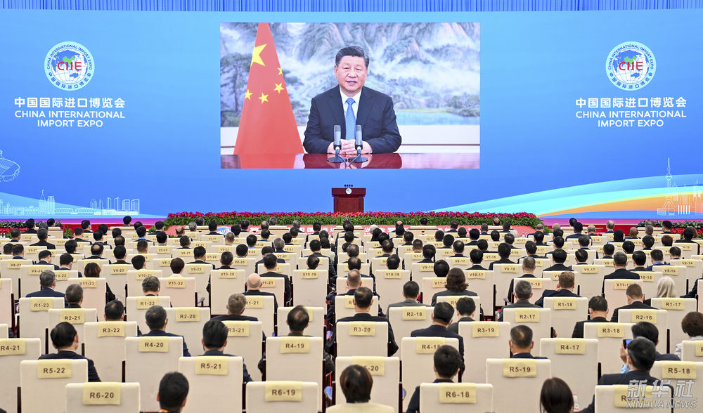 ↑2021年11月4日晚,习近平以视频方式出席第四届中国国际进口博览会开幕式并发表题为《让开放的春风温暖世界》的主旨演讲。