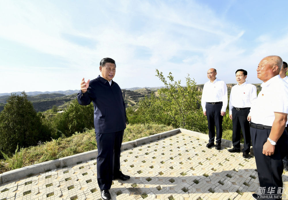 ↑2021年9月13日下午,习近平在陕西省榆林市米脂县银州街道高西沟村龙头山山顶,考察黄土丘陵沟壑区综合治理情况。