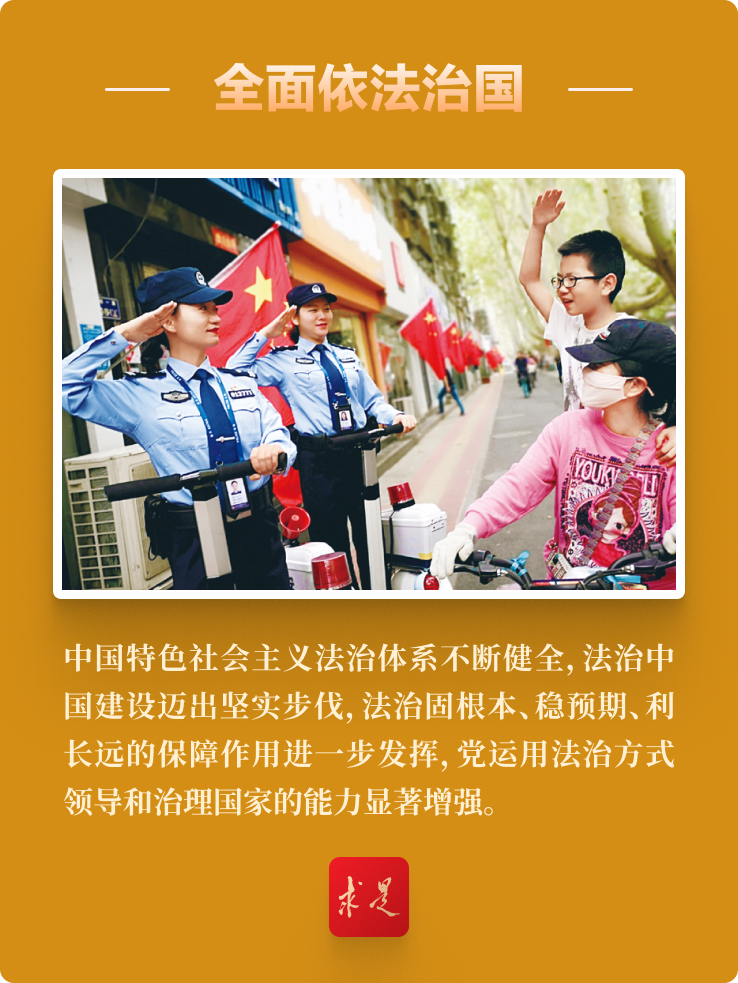 “中国特色社会主义法治体系不断健全,法治中国建设迈出坚实步伐,法治固根本、稳预期、利长远的保障作用进一步发挥,党运用法治方式领导和治理国家的能力显著增强。”
