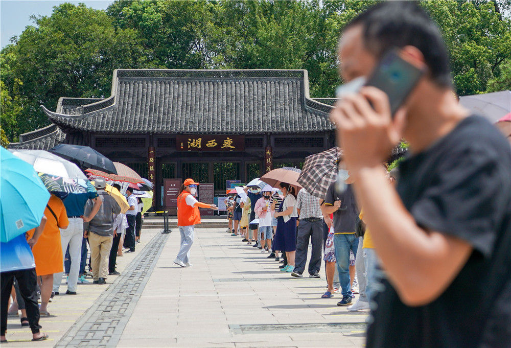 市民在扬州市瘦西湖街道五亭社区瘦西湖西门采样点排队,准备进行核酸检测(8月7日摄)。新华社记者 李博 摄