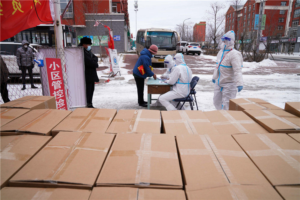 在黑龙江省黑河市爱辉区一小区,社区工作人员为居民发放免费生活物资(11月10日摄)。新华社记者 王松 摄