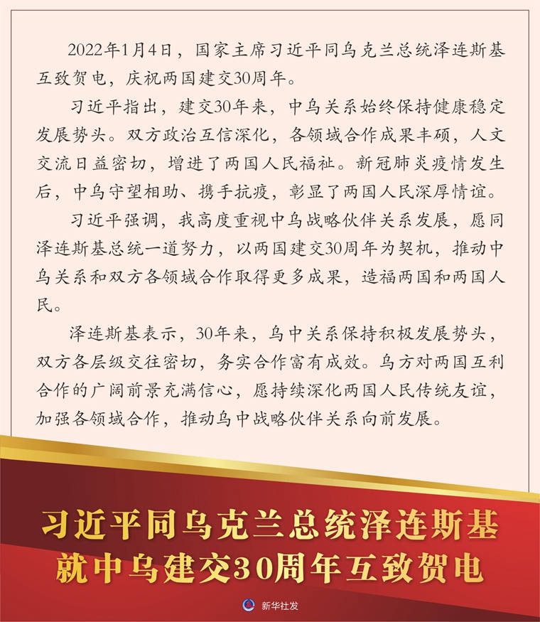 新华社北京1月4日电 2022年1月4日,国家主席习近平同乌克兰总统泽连斯基互致贺电,庆祝两国建交30周年。