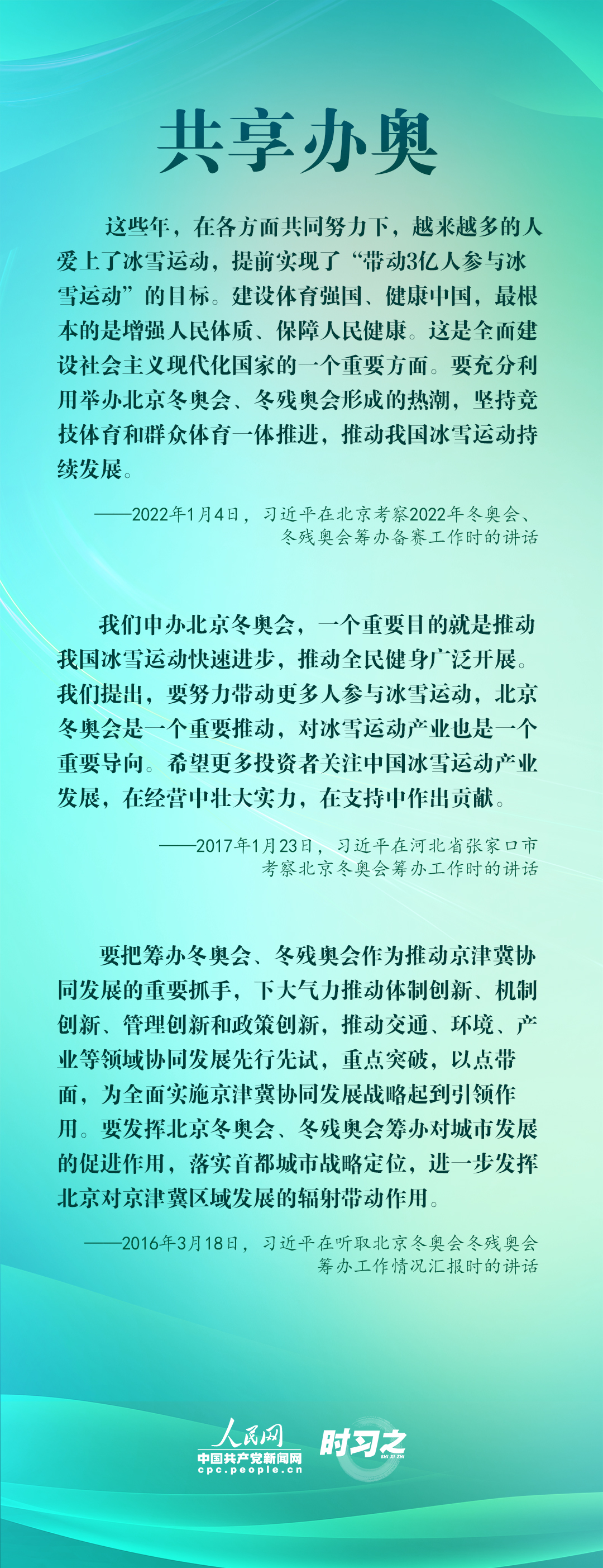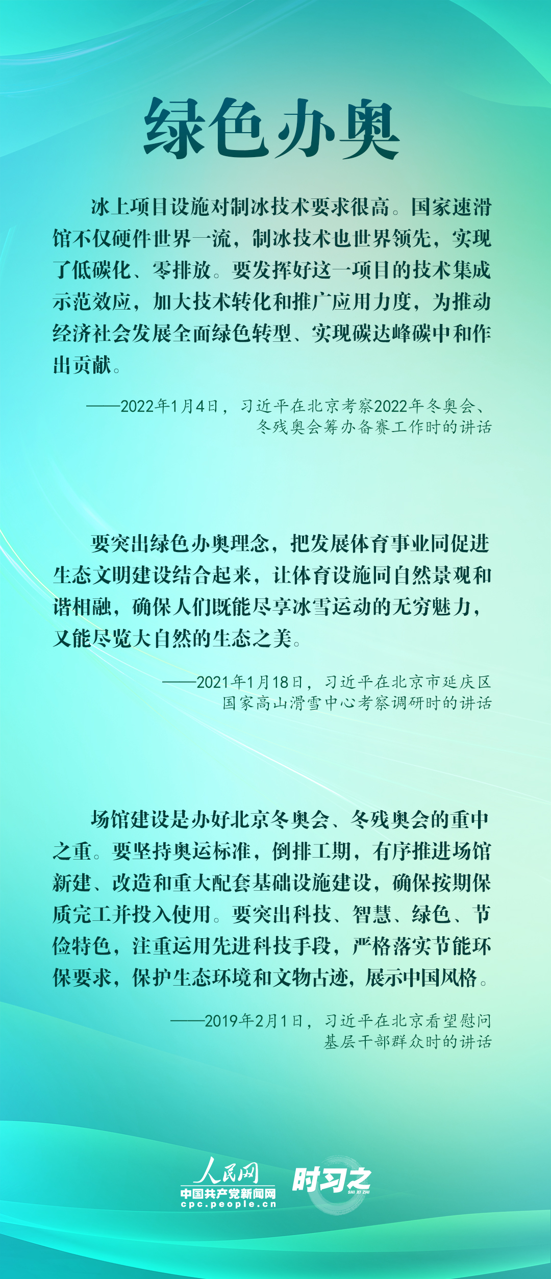 1月4日,习近平在北京考察2022年冬奥会、冬残奥会筹办备赛工作,指出“要坚持绿色办奥、共享办奥、开放办奥、廉洁办奥的理念,突出科技、智慧、绿色、节俭特色”。办好北京冬奥会、冬残奥会,是中国向国际社会作出的庄严承诺。习近平多次调研并强调绿色、共享、开放、廉洁的办奥理念。