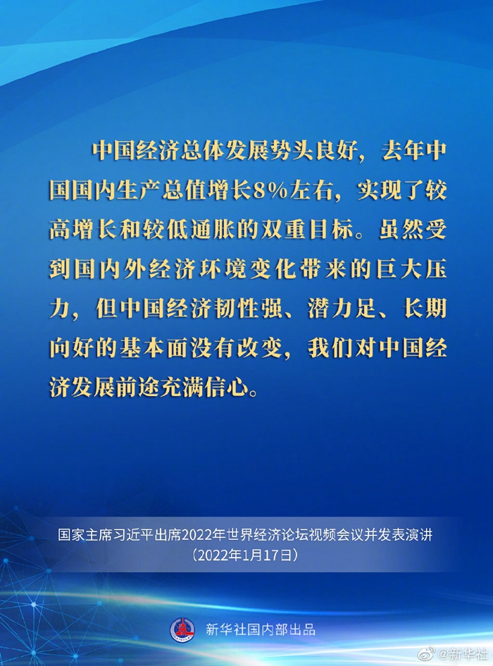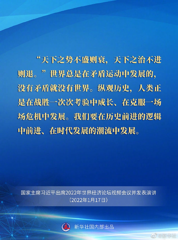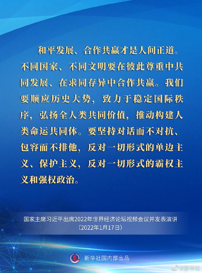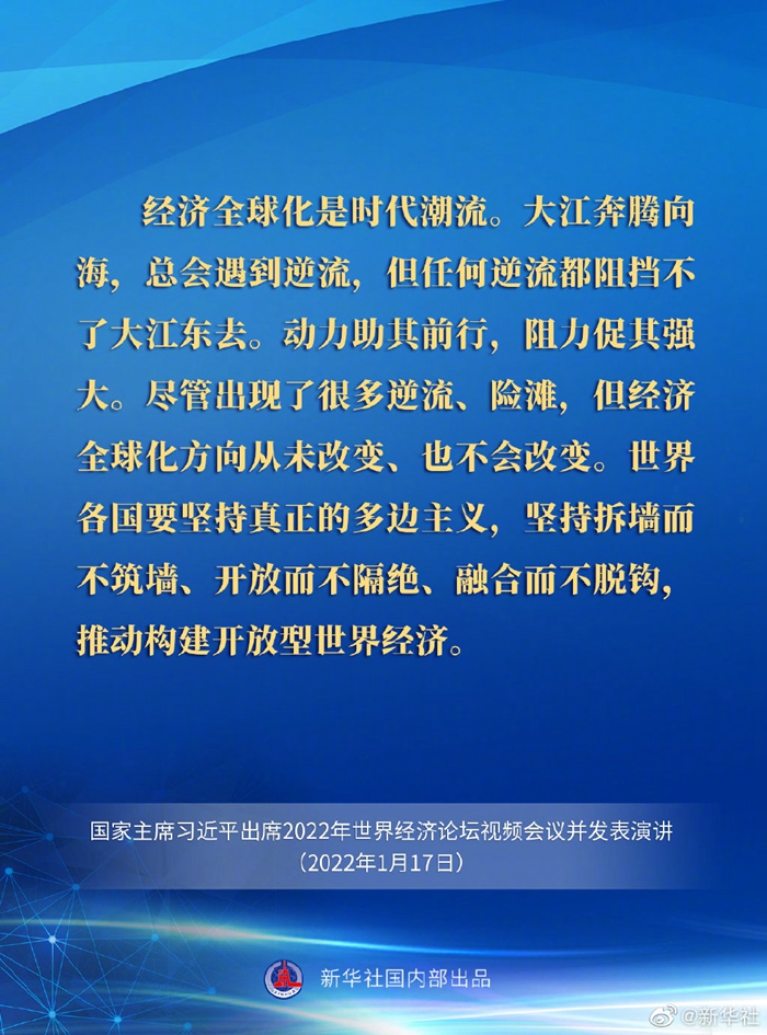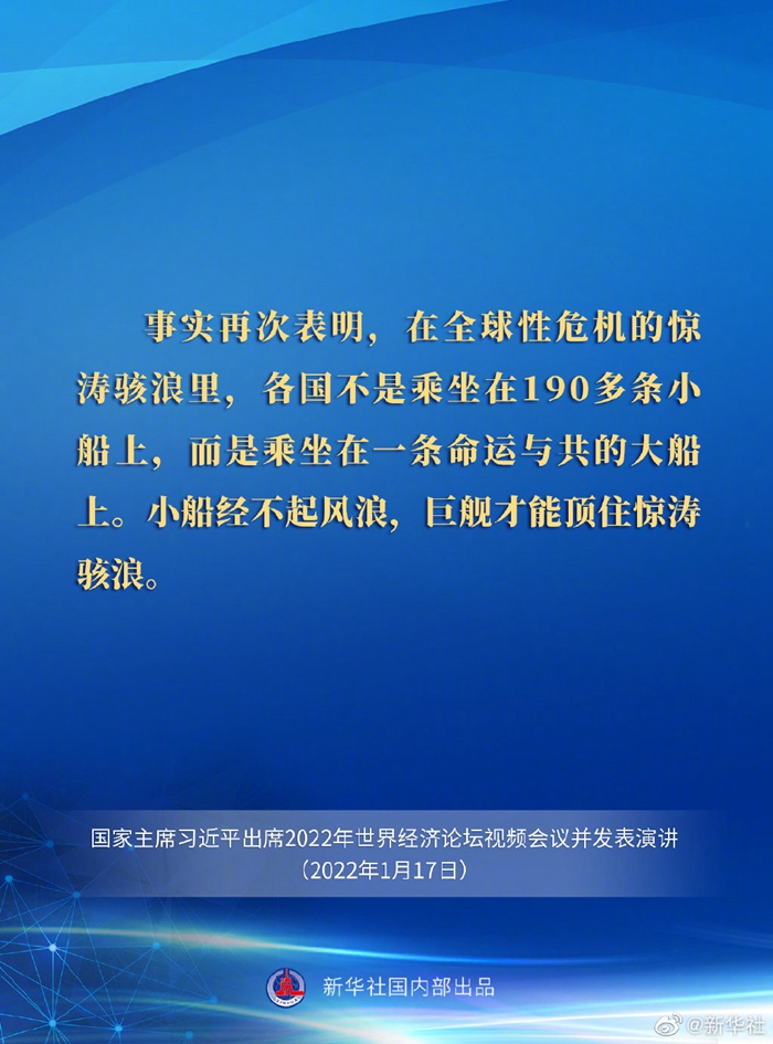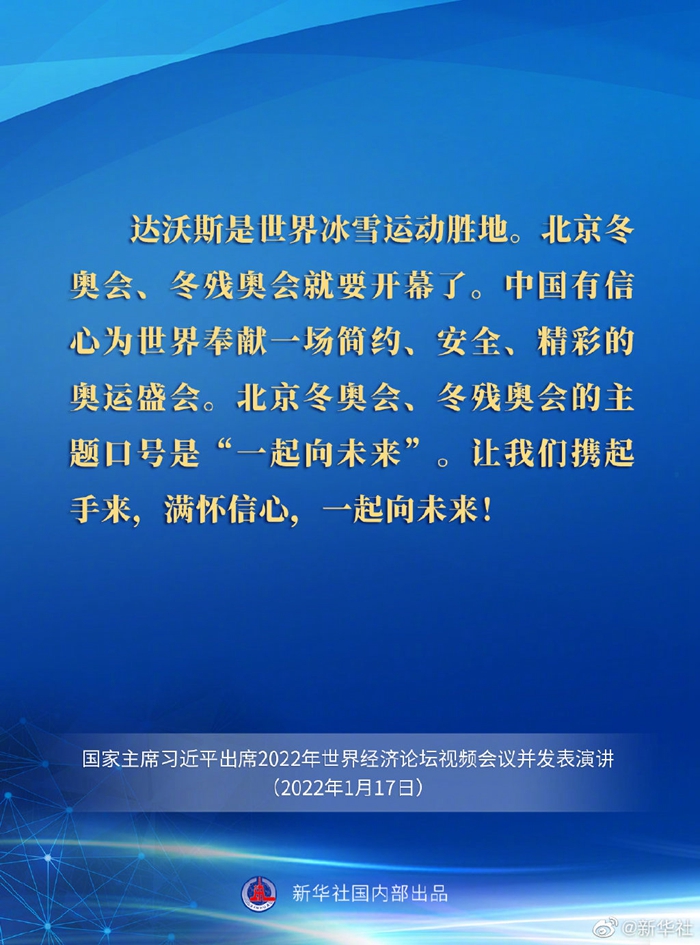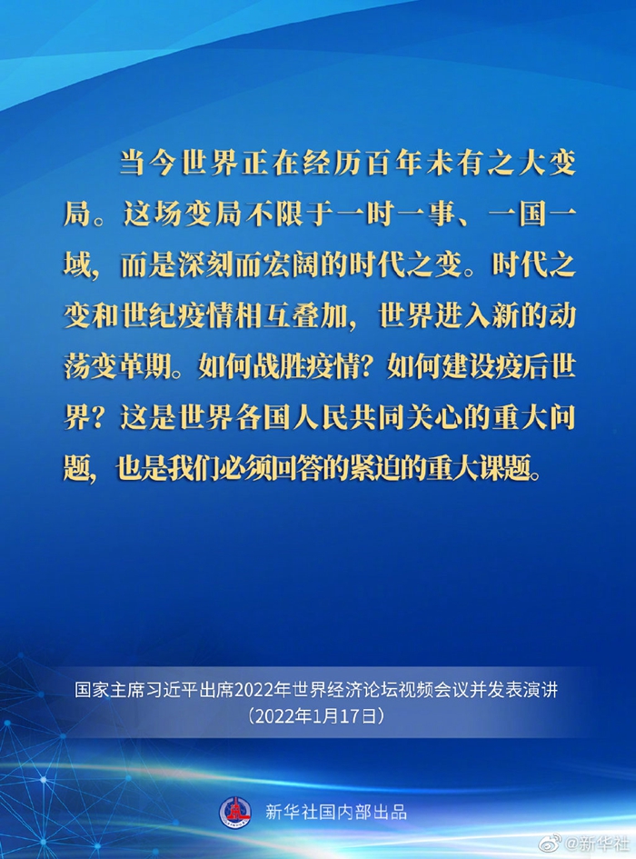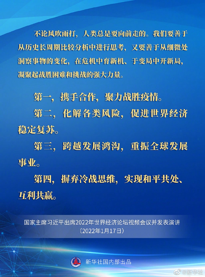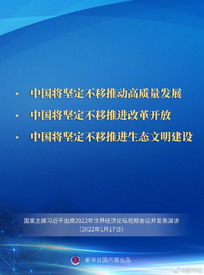 习近平在2022年世界经济论坛视频会议上的演讲要点速览 编辑:高方勇 来源:新华社微博 浏览次数: 次 发布时间:2022-01-18 08:42:11 【字体:小 大】 1月17日,国家主席习近平在北京出席2022年世界经济论坛视频会议并发表演讲。一起看要点。 扫一扫在手机打开当前页 【打印正文】 上一篇:《习近平谈治国理政》第三卷5种少数民族文字版出版发行 [ 2022-01-18 ] 下一篇:第1视点|习近平:让希望的阳光照亮人类 [ 2022-01-18 ]