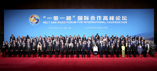 2017年5月14日,国家主席习近平在北京出席“一带一路”国际合作高峰论坛开幕式,并发表题为《携手推进“一带一路”建设》的主旨演讲。这是习近平同出席“一带一路”国际合作高峰论坛的代表们合影。新华社记者 庞兴雷摄