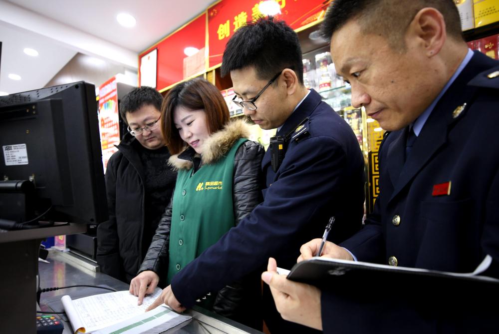 河北大厂回族自治县纪检干部和税务部门稽查人员在一家超市检查是否有单位公款购买购物卡情况(2019年1月22日摄)。新华社记者 王晓 摄