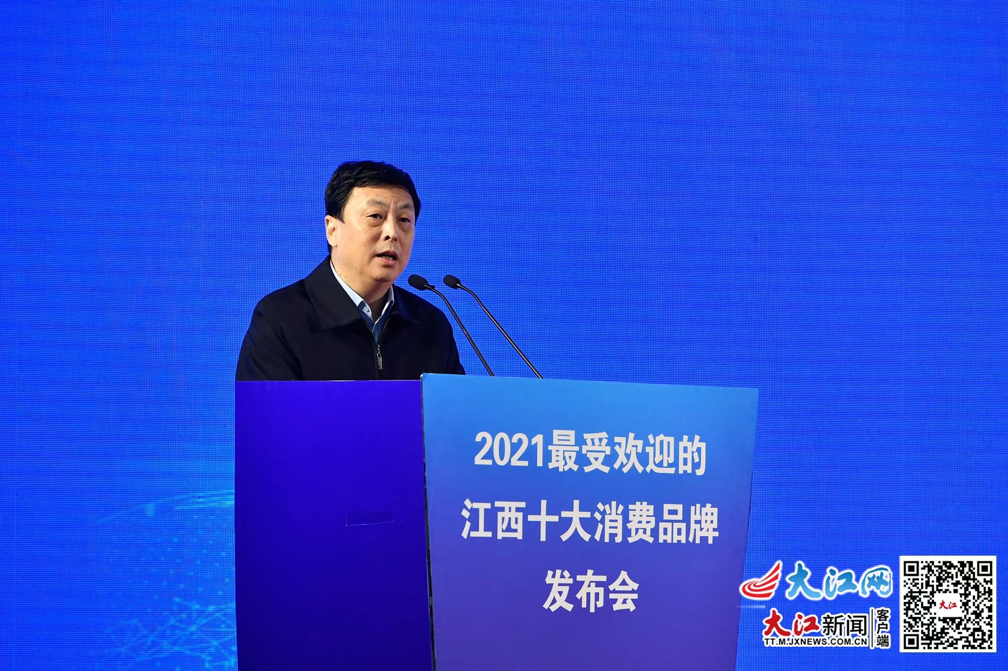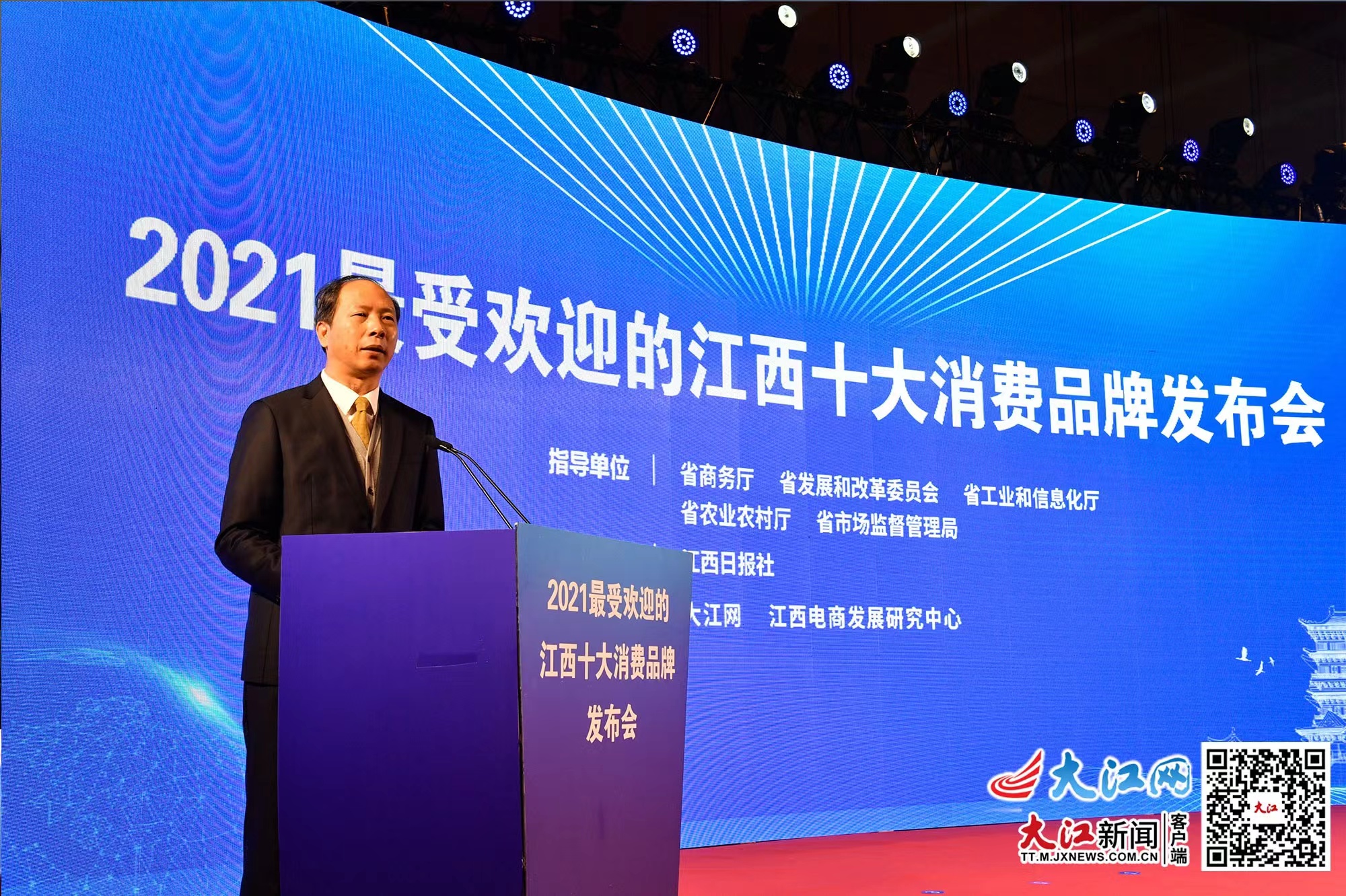 大江网/大江新闻客户端讯 记者左阳天、实习生张楠报道:1月25日上午,2021最受欢迎的江西十大消费品牌颁奖礼在南昌举行。江西省人民政府副省长、党组副书记殷美根,省政府副秘书长刘晓艺出席。江西省商务厅党组书记、厅长谢一平,江西日报社社长、江西报业传媒集团有限责任公司党委书记、董事长黄万林分别致辞, 江西财经大学原党委书记、校长、教授王乔作专家发言。