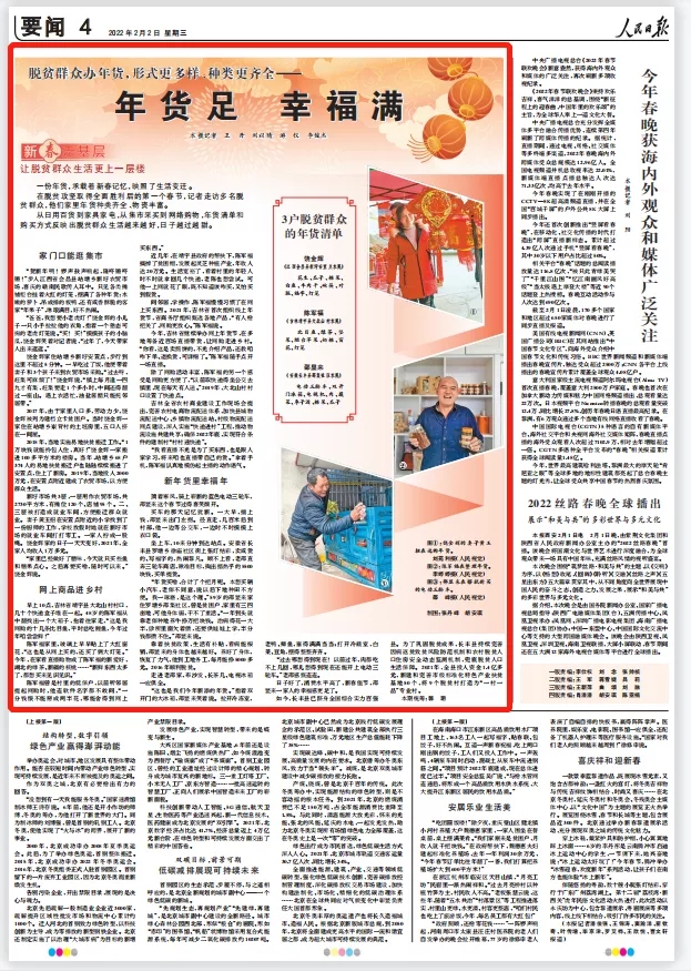 把握春节这一特殊节点,赣州加强外宣选题策划,集中优势力量采编,瞄准媒体平台推送。2月1日,新华每日电讯刊发《一起向未来:虎年新春夜话》,报道于都县银坑镇村民谢南海一家与驻村干部共度吉祥年;同日,中央广播电视总台播发《工地上的团圆饭 天南地北春节味》,报道位于赣县区的中科院赣江创新研究院项目春节不停工,工人就地过春节。2月2日,人民日报刊发《年货足 幸福满》,报道会昌县新圩安置点农民饶金辉逛集市备年货,反映赣南脱贫群众的生活变迁。经济日报1月31日、2月4日分别刊发视觉专版,信丰县装扮城市喜迎新春、安远县东生围景区游客如织的画面跃然纸上。江西日报2月3日刊发《深入基层报道火热生活和工作》,报道该社赣州分社记者曹章保帮助于都县村民与儿子视频连线,实现“云团圆”。2月5日,人民日报客户端江西频道刊发《江西帮扶火炬手吉志雄:火炬“飞扬” 一起向未来》,报道曾在寻乌县挂职帮扶五年的全国供销总社干部、冬奥会火炬手吉志雄。2月6日,央广网刊发《江西“冰球娃”为冬奥健儿加油助威》,报道石城县轮滑冰球队小队员们的训练故事……上级媒体接连关注赣州,围绕“两个不停”、迎冬奥、疫情防控、文旅活动、客家年味、乡村振兴、“我为群众办实事”等主题,浓墨重彩报道了各地热闹过春节的情景,充分肯定了赣州高质量发展的成绩。