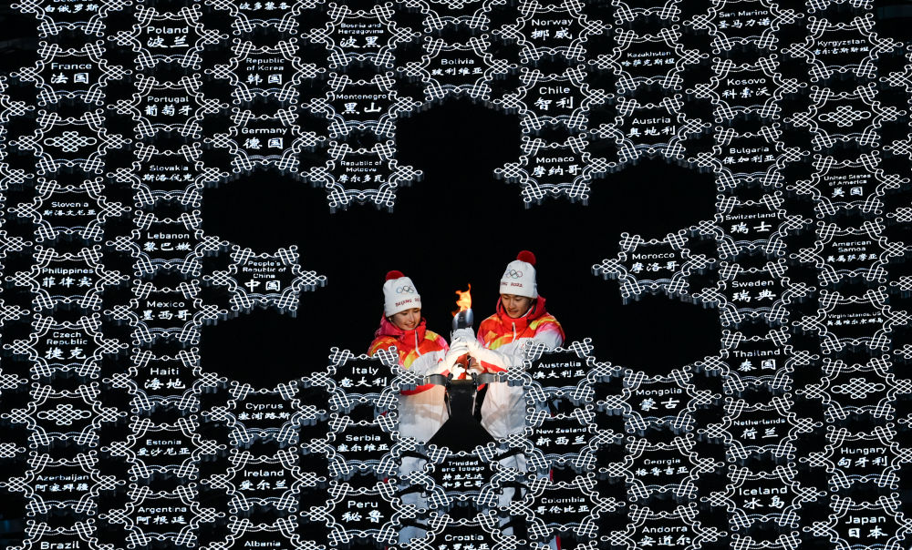 2月4日晚,第二十四届冬季奥林匹克运动会开幕式在北京国家体育场举行。这是最后一棒火炬手迪妮格尔·衣拉木江(左)和赵嘉文将火炬嵌入“大雪花”中央。