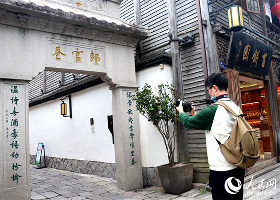 一位游客在拍摄郎官巷。人民网 林晓丽摄踏着青石板路,从郎官巷的巷口走到严复故居只有一两分钟的步程。
