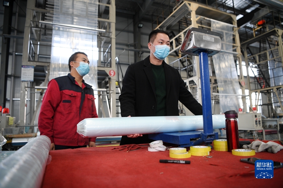 2022年1月28日,闽商郑开煌(右)在位于宁夏隆德县闽宁扶贫产业园的农用薄膜生产线查看产品质量。新华社记者 王鹏 摄