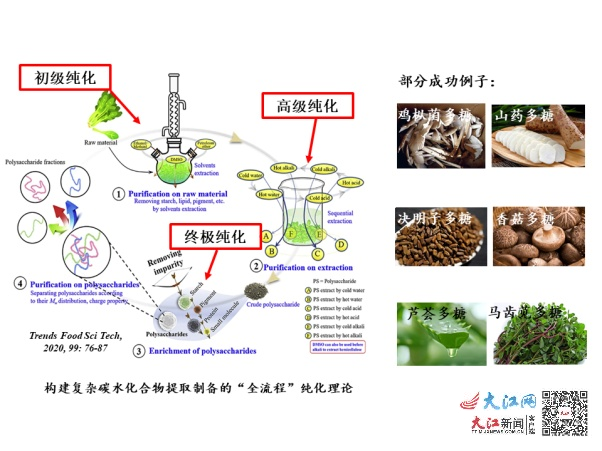 南昌大学研究人员在国家自然科学基金优青、杰青、国家重点研发计划等项目的支持下,以多糖为对象,针对复杂碳水化合物的结构特点,创新结构表征理论:首次提出表征以多糖为代表的复杂碳水化合物结构应满足的两大核心前提要素(“多糖均一结构的多维性”和“多糖结构的相对有序性”),同时创新复杂基质中复杂碳水化合物提取制备的“全流程”纯化理论,最后依托“部分降解-甲基化-NMR”复杂碳水化合物结构解析技术体系,成功解析了阿拉伯胶、黑灵芝多糖、车前子多糖等近30余种食品中复杂碳水化合物精细结构,为全面、科学认识复杂碳水化合物结构及其功能活性物质结构基础提供了强有力的支撑。
