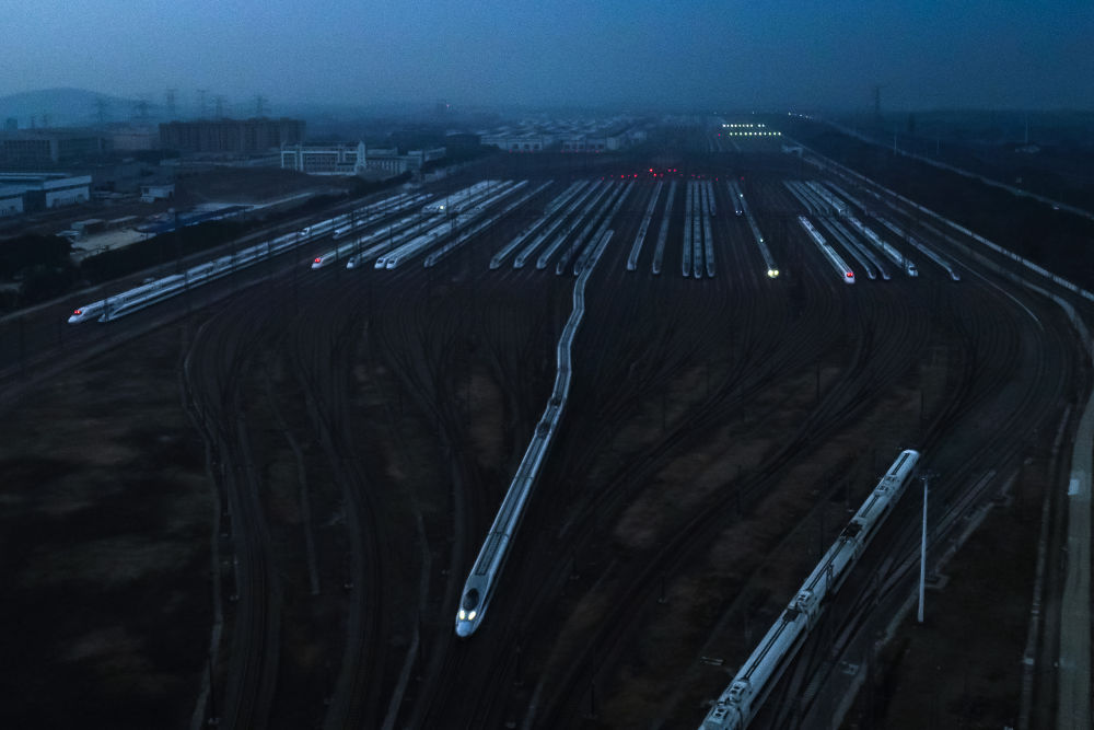 2022年第一天,几十组动车经过武汉动车段工作人员通宵检修后,在黎明时分陆续驶出。新华社记者肖艺九摄