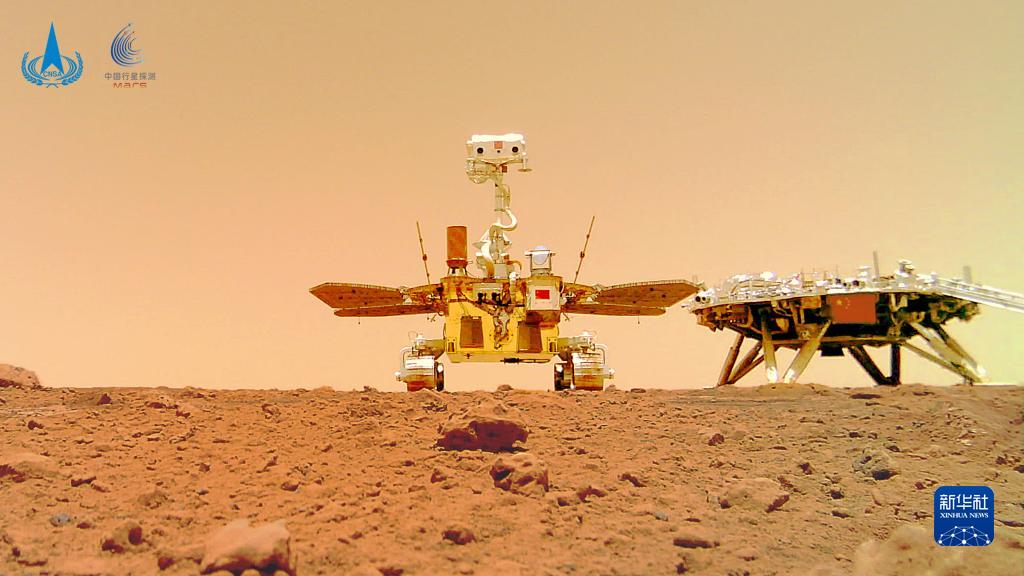 这是“着巡合影”图。2021年6月11日,国家航天局在北京举行天问一号探测器着陆火星首批科学影像图揭幕仪式,公布了由祝融号火星车拍摄的着陆点全景、火星地形地貌、“中国印迹”和“着巡合影”等影像图。首批科学影像图的发布,标志着我国首次火星探测任务取得圆满成功。新华社发(国家航天局供图)